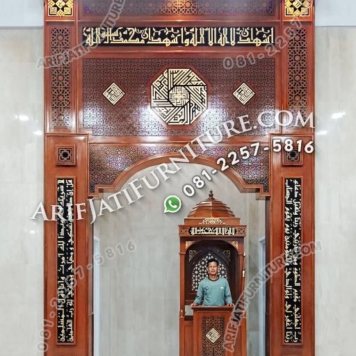 Dinding mihrab masjid kayu jati ukir Jepara kini mulai banyak diminati oleh customer dari berbagai kota maupun provinsi karena menambah kesan indah, megah dan mewah. Mihrab pengimaman masjid yang indah juga akan menjadi ciri khas dan identik dengan masjid tertentu di suatu daerah dan memungkinkan untuk menjadi daya tarik jamaah dari luar. Bahan baku pembuatan dekorasi mihrab pengimaman tersebut yaitu dari jenis kayu jati pilihan kualitas bagus yang bernilai seni kerajinan tangan dan juga seni ukir khas Jepara. Meskipun dinding pengimaman di masjid daerah anda tidak terlalu luas dan lebar, akan tetap terlihat indah dan bagus apabila diterapkan mihrab ukir jati Jepara.