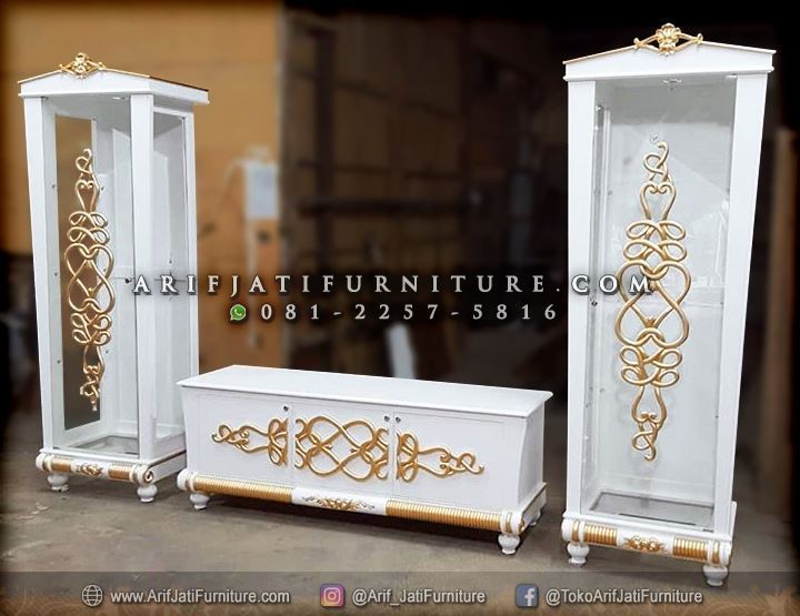 Meja TV Classic Minimalis Modern dengan warna putih cat duco yang terkesan elegant dan mewah untuk melengkapi furniture ruang keluarga desain terbaru. Paduan warna putih dan emas pada meja tv ini menghasilkan kombinasi warna yang cantik dan cocok untuk warna ruangan apapun karena warna putih merupakan warna netral. Meja tv modern ini dapat anda pesan dengan pilihan bahan baku antara kayu jati maupun kayu mahoni dengan keunggulan dan sifat kayu yang berbeda-beda. Begitu juga dengan ukuran dan bentuk desain meja serta lemari kaca yang dapat anda rubah sesuai keinginan maupun menyesuaikan space ruangan yang tersedia.