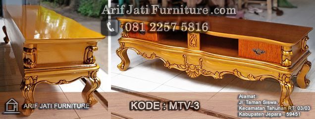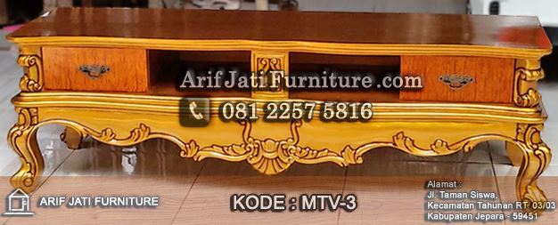 Meja TV Ukiran Klasik Warna Emas Mewah kali ini adalah pesanan salah satu customer kami. Customer Arif Jati Furniture kami juga memesan produk lemari jam hias Brawijaya sebagai set perabotan untuk ruang TV. Meja tv ukiran klasik ini kami produksi berbahan dasar kayu jati pilihan. Dengan proses pewarnaan emas melamine gloss serta motif water drop pada laci.