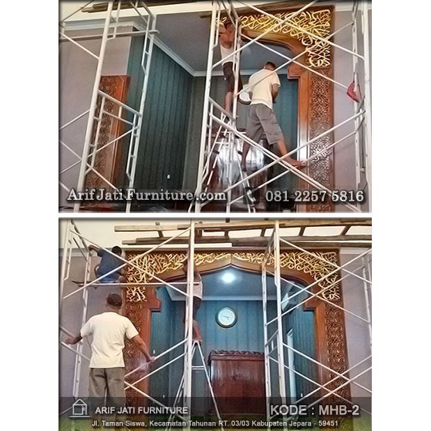 Mihrab Pengimaman Masjid Kayu Jati TPK kali ini merupakan salah satu contoh dan testimonial produk dari customer kami dari Lampung. Arif Jati Furniture kami melayani pemesanan mihrab pengimaman masjid baik dengan desain dari ajuan kami maupun dari anda sendiri. Mihrab pengimaman kayu jati kami terbuat dari golongan kayu jati TPK grade A kualitas super yang paling kokoh. Berikut kami sertakan contoh gambar foto proses pengerjaan mihrab masjid :