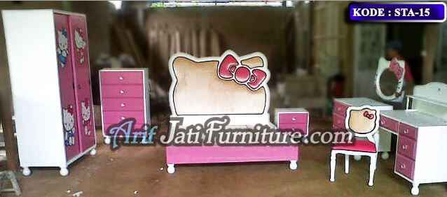 Set Kamar Tidur Hello Kitty anak perempuan warna pink kini mulai banyak diminati oleh customer mebel Jepara . Kamar set Hello Kitty ini sangat cocok untuk memanjakan buah hati anda dengan perabotan furniture kamar yang feminim . Paduan antara desain dan warna lebih memberikan kesan cantik dan cocok untuk warna ruangan yang netral yaitu warna putih . Set kamar tidur model terbaru ini dapat kami produksi dari bahan baku kayu jati maupun kayu mahoni sesuai permintaan . Arif Jati Furniture kami akan selalu memberikan produk mebel berkualitas untuk kepuasan customer kami .