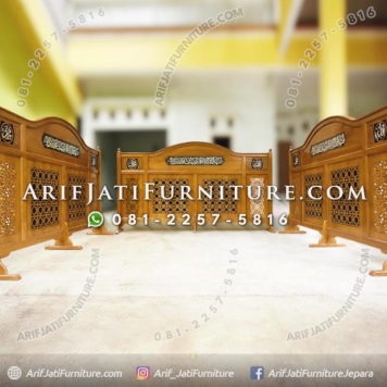 Sekat Pembatas Shaf Ukir Kaligrafi Sekat Pembatas Shaf Ukir Kaligrafi dari bahan kayu jati solid dapat menjadi pilihan alternatif selain tabir kain maupun stainless. Kelebihan dari tabir masjid kayu jati yakni memberikan tampilan yang serasi dengan produk mebel masjid kayu jati yang lainnya serta mengandung kerajinan seni ukir kayu. Tabir penyekat shaf pria dan wanita… selengkapnya