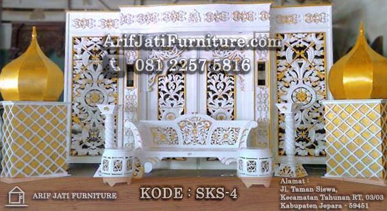 Sketsel Pelaminan Cat Duco Motif Baru produk furniture Jepara saat ini menyesuaikan permintaan pasar maupun desain terbaru. Yaitu desain yang lebih simple namun tetap mewah dengan hiasan ukiran. Tentu saja motif ukiran pada produk motif baru Arif Jati Furniture kami juga disesuaikan agar lebih serasi dan terlihat bagus. Warna putih pada produk akan membuat dekorasi pelaminan lebih terlihat cantik dan elegant serta cocok untuk warna ruangan apapun. Model sketsel pengantin warna putih terbaru juga dapat anda pesan dengan tambahan bentuk kubah untuk nuansa islami.
