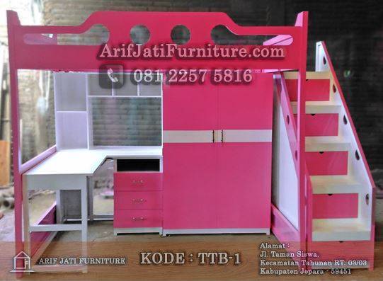 Tempat Tidur Tingkat Pink Multifungsi merupakan alternatif pilihan bagi kamar anak yang tidak terlalu luas. Tempat tidur tingkat warna pink multifungsi memiliki fitur yang dapat dirakit menjadi satu produk. Produk mebel tempat tidur anak tingkat multifungsi ini merupakan model terbaru yang sangat jarang dan hampir tidak dapat anda temukan di pasaran. Hal ini karena produk tersebut hanya dibuat apabila terdapat permintaan pesanan saja. Anda dapat memesan tempat tidur anak mewah ini dengan perubahan ukuran, fitur dan warna finishing lain yang disukai anak anda.